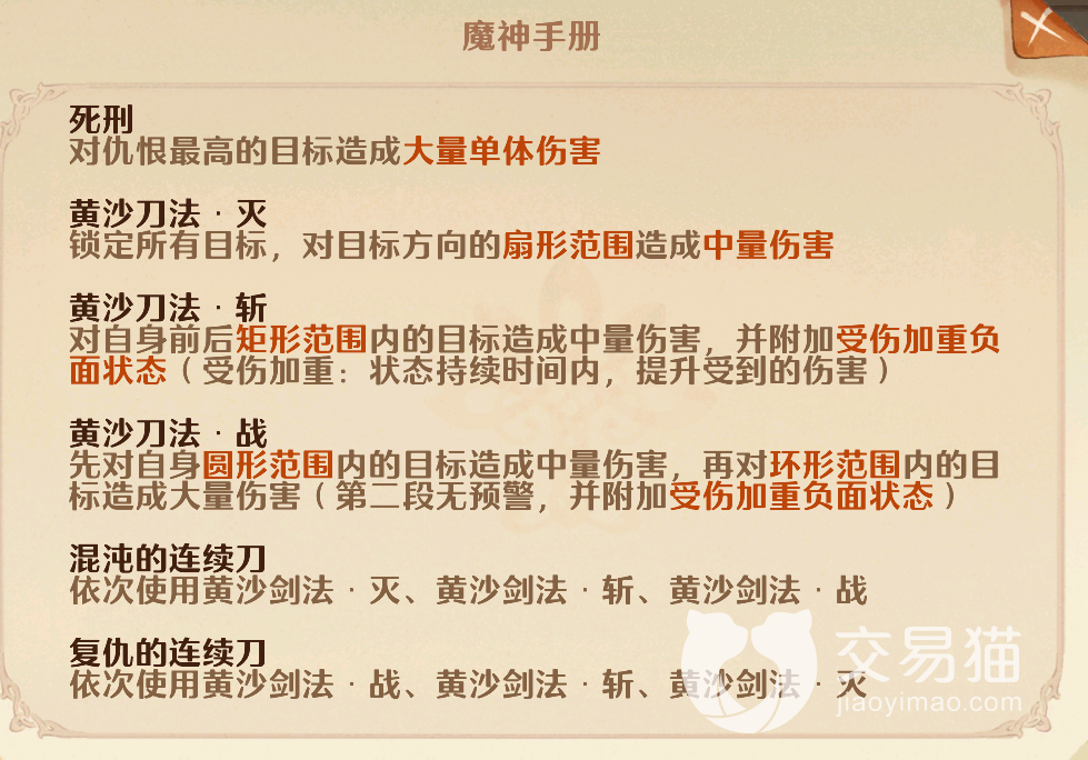 不过具体的操作还需要结合莫格拉斯的能力来及时进行调整,通过魔神手册很容易就能发现它有着足足九个技能,这些技能的施放从循序渐进的,想击败它们的话就需要在它使用对应招式时调整相应的操作进行应对,首先“死刑”这招是一个比较普通的招式,它会对仇恨最高的目标造成大量单体伤害,所以首要仇恨目标一定要由格挡能力最强的盾卫去担任,仇恨千万不能转移到其他的脆皮职业身上。