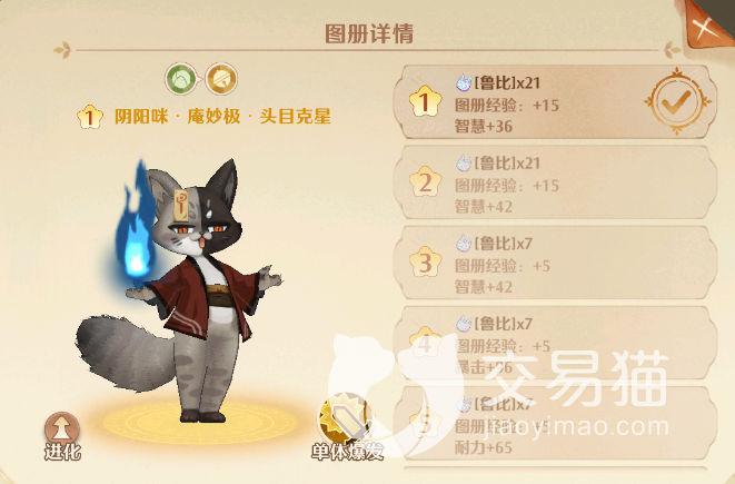 这个猫灵的全名叫【阴阳咪·庵妙极】,猫灵在强化到2星的时候就会解锁链接技能,会让猫灵的基础技能伤害提高,技能伤害属于单体爆发,而它的属性是【头目克星】,阴阳咪的强化属性主要是增加主角的【智慧】【暴击】和【耐力】。比较适合射手这类远程输出的角色。