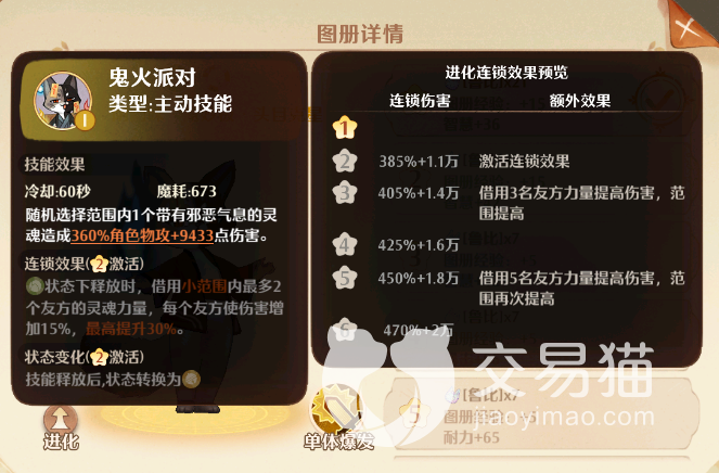 阴阳咪的技能【鬼火派对】:开启技能后会消耗673点魔法值,会随机选中一个范围,范围内带有一个邪恶的气息灵魂,对敌人造成360%角色物攻,额外增加9433点伤害,当阴阳咪的技能在【头目克星】状态下释放的话,会借用小范围内最多2个友方的灵魂力量,为每一个友方增加15%的伤害,这个伤害最高提升至30%。