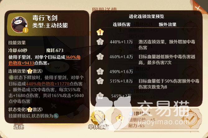 玩家们在使用猫灵技能的时候,忍者咪会使用手中的剑,对单个目标造成360%角色物攻额外增加9433点固定伤害,在强化到二星的时候会激活特有的属性,激活后如果是在【头目克星】状态下使用技能的话,会提升技能伤害至440%角色物攻,额外增加11770点固定伤害。