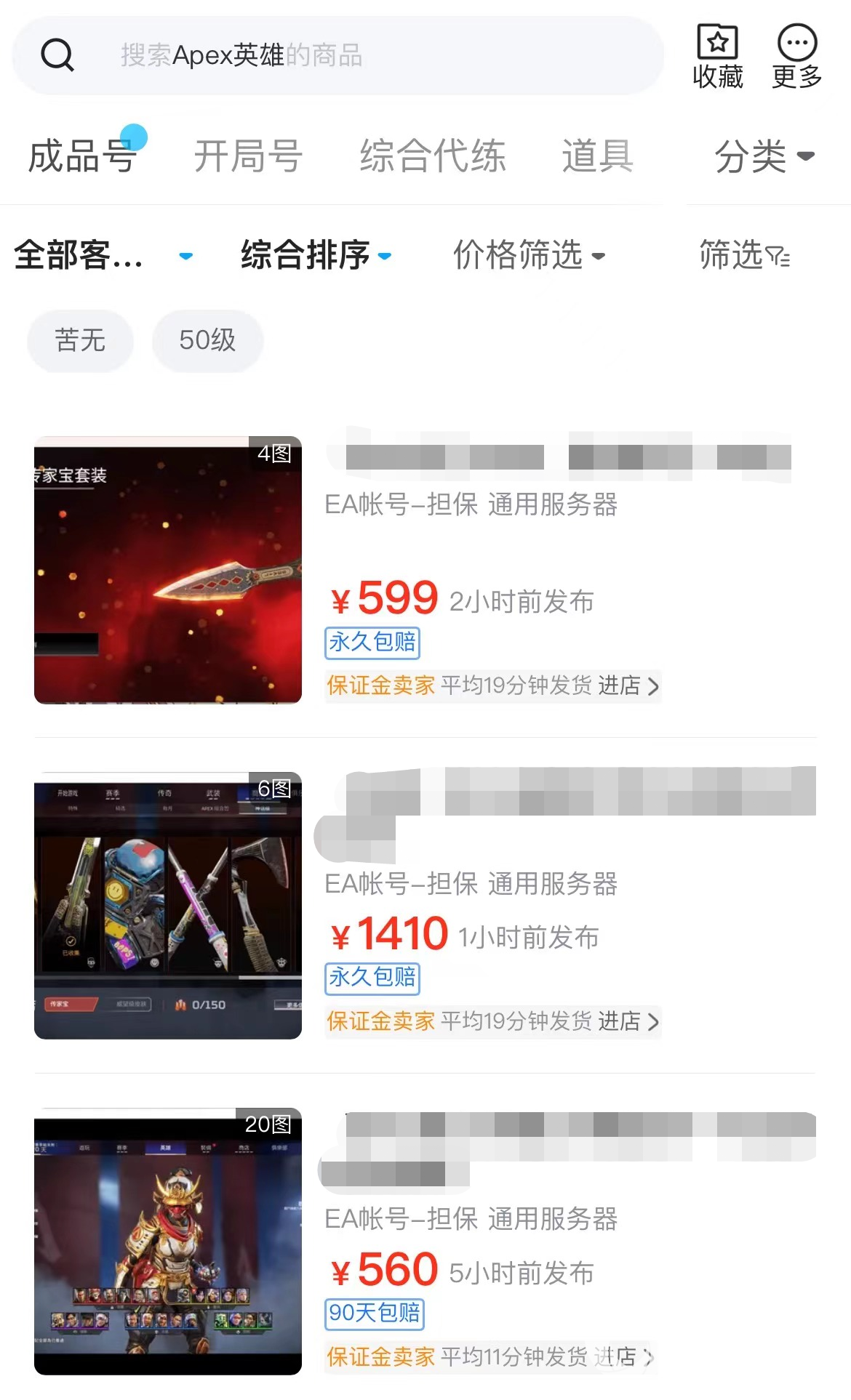 这个平台就是交易猫,它收录了apex英雄的开局号、成品号,还能购买捆绑包道具,没有时间玩游戏的话也可以在里面找到优质代练来帮忙做任务玩游戏。成品号当中又分为不同的段位,如果对价格有要求的话,只要选择价格范围,点击确定就能看到符合要求的账号了。
