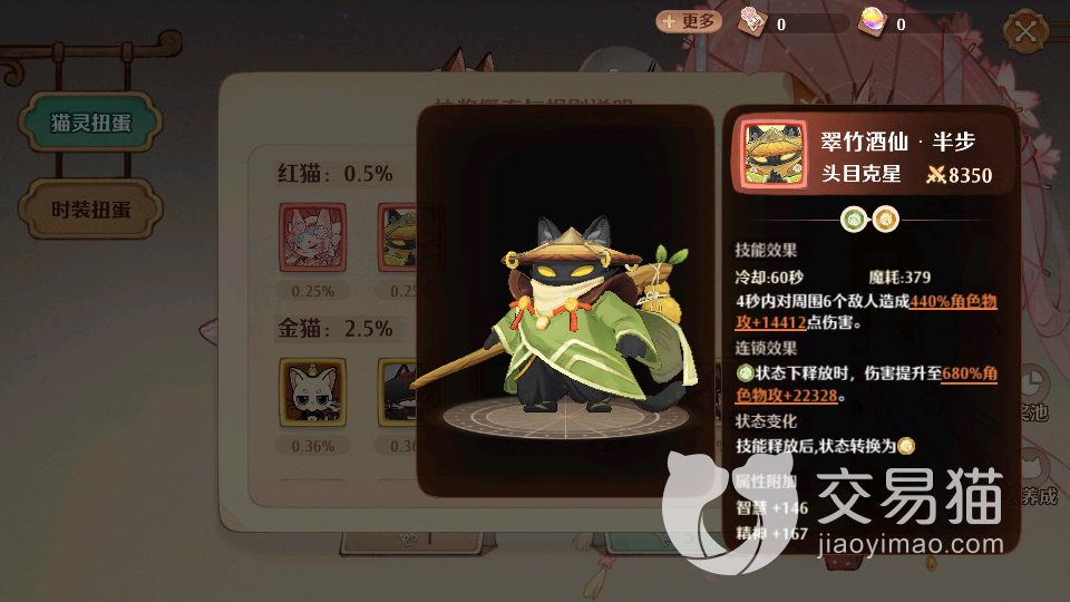 第二个值得培养的猫灵为翠竹酒仙半步,他是一个非常独特的猫灵。与落樱花魁有着相似之处,不过这个角色只能造成物理攻击伤害,在释放的时候最高可以提升680%的角色攻击实力。基础战力也是8000多,与落樱花魁并列红色猫灵榜首,可以帮助玩家们快速提高攻击实力。在使用这个猫灵的时候,玩家们的智慧以及精神都将提升不少,是一个不可多得的全面型猫灵。