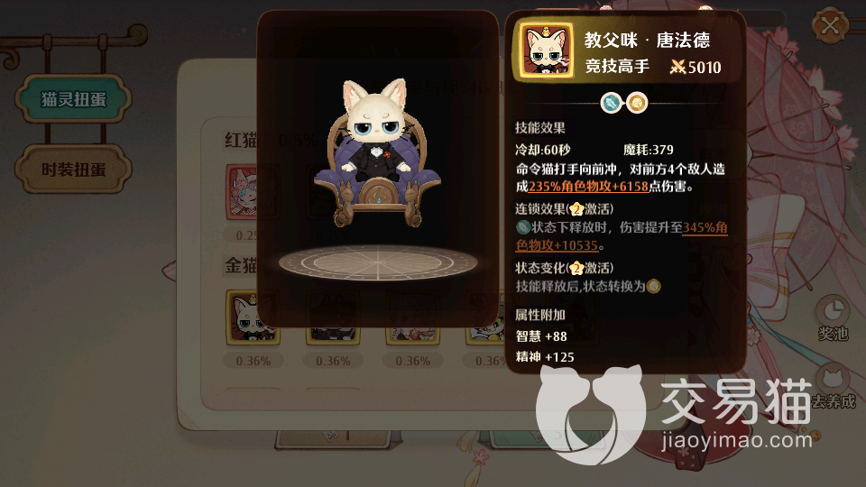 第三个值得推荐的猫灵为教父喵唐法德,这个猫灵比之前的两个猫灵实力稍差一些,基础战力只有5000左右,不过他的攻击效果较为强势。拥有范围攻击的能力,这是其他猫灵没有的,而且这个猫灵外观也比较可爱,是很多女孩子梦寐以求的。