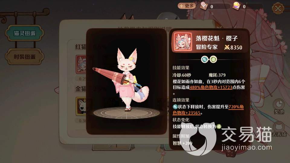 首先第一个值得培养的猫灵叫做樱子,她是落樱花魁,外观非常好看,拥有粉粉嫩嫩的皮肤,大家别看她看上去如此优雅,但是战力确实非常的强势,输出效果给力,可以对范围内的敌人造成最高480%的攻击伤害,而且还会有一定的物理输出效果,冷却时间为60秒,每次使用魔耗为379。在连锁效果下,她还能提升720%的角色物攻释放状态,智慧也将叠加209,这对于玩家们来说可是非常强势的,基础战力就高达8000多,是游戏内为数不多的红色品质猫咪,不过获取难度也较高。