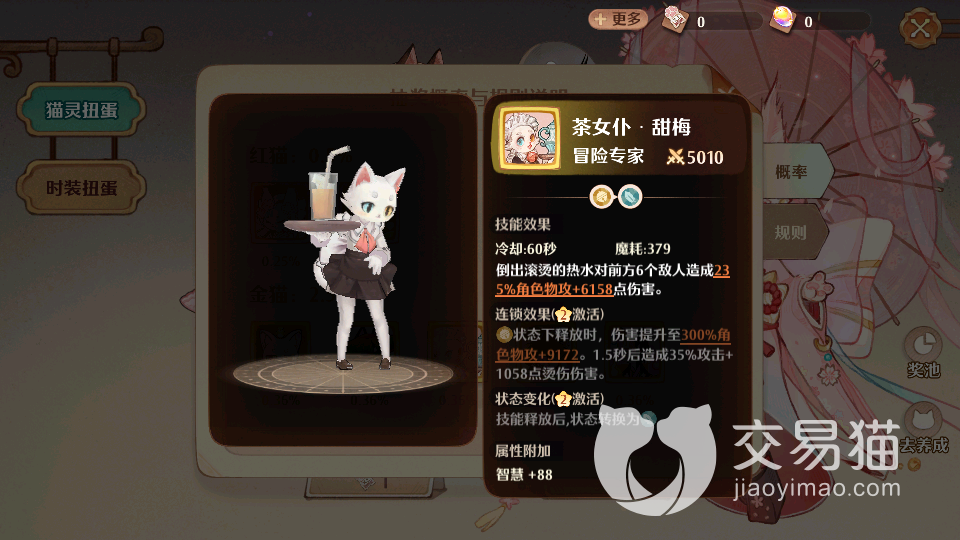 第四个值得推荐的猫灵是茶女仆甜梅,这个角色可以通过首充礼包获取,她的攻击实力较为强势,而且外观非常的可爱,玩家们可以轻松入手,培养起来没有任何难度,基础攻击在5010,魔耗在379,她可以造成235的物理攻击效果,同时也会有一定的连锁攻击能力,智慧叠加88,虽然没有前面几个猫灵强势,但是她却拥有持续消耗的效果,可以造成一定的烫伤伤害,让对手无处可躲。
