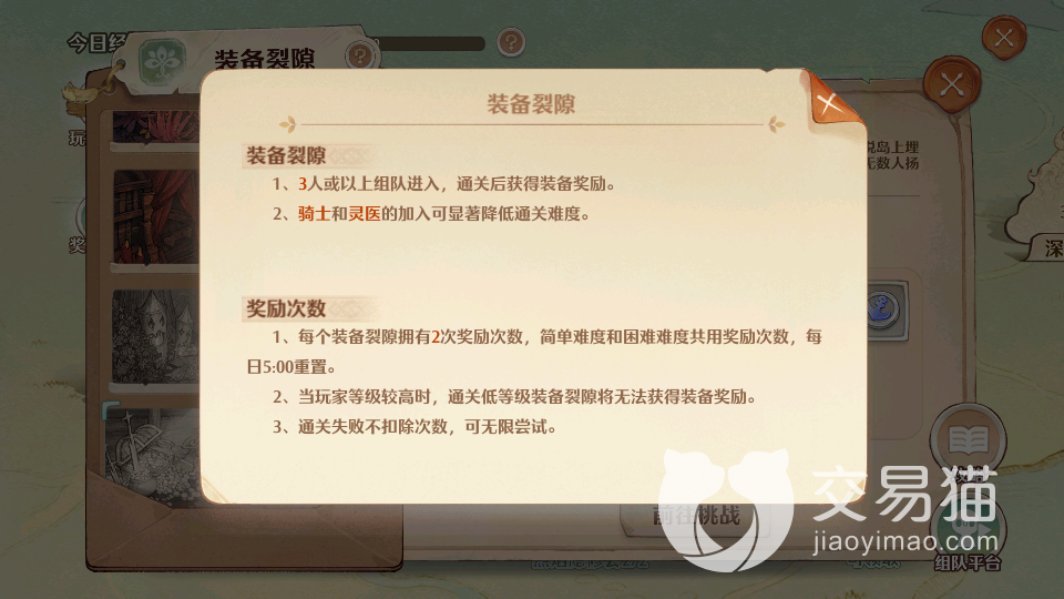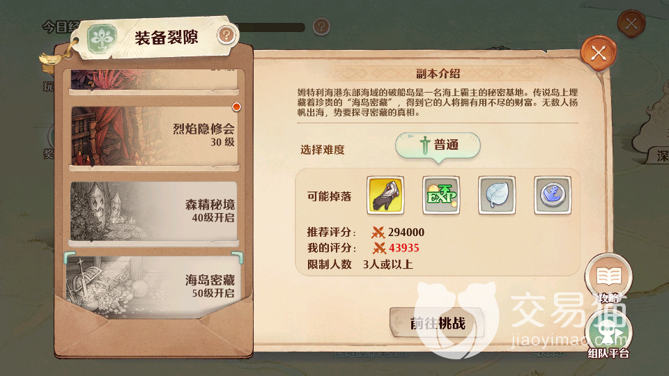 目前这个海岛密藏只有一个普通版本,玩家们只需要评分达到29万以上就可以参与,限制人数在三人以上,最少三人,最多五人共同参与。对于玩家们来说,这个副本挑战难度较高,最好是组成五人团队,而且阵容搭配也要谨慎一点。输出,辅助,治疗都需要拥有,前排带有一个坦克,帮助队友抵挡伤害,提升队伍的续航能力至关重要。