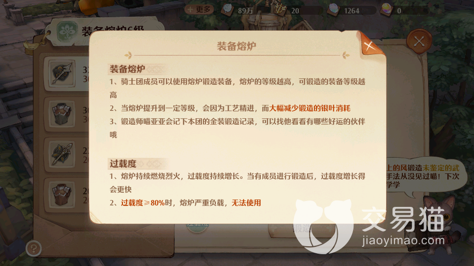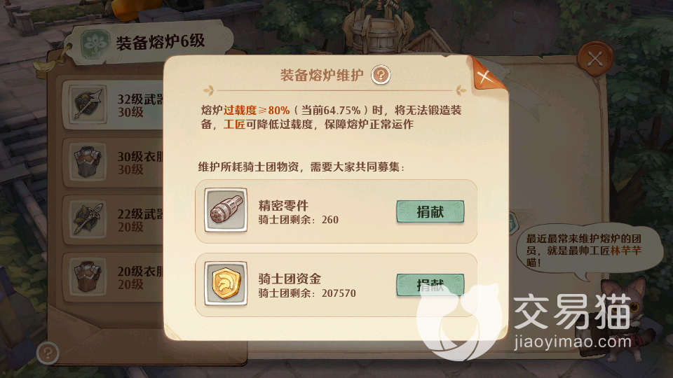 玩家们每制造一次,我们熔炉的过载量都会下降一点,当熔炉的过载量降低到一定程度时,我们的熔炉将无法正常运行,玩家们就需要捐献骑士团资金以及精密零件来进行修复的,这些物资都是大家共同募集的,而这个装备熔炉也属于整个骑士团的重要物资,需要大家一起呵护。