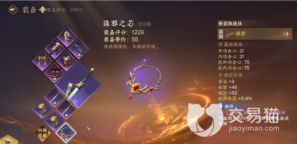 首饰-幽人芳夜镯,想要佩戴该首饰的玩家必须满足65级才可以,评分是1113,玩家可以在江湖的探索里边获取到,佩戴会增强角色的基础属性和内功,固定词条帮助提升气海,会心伤害也会增加。