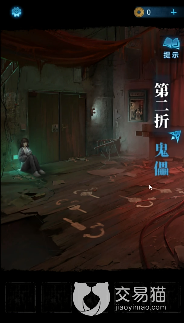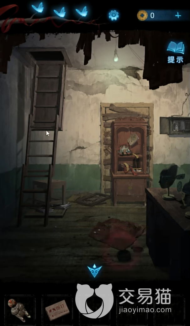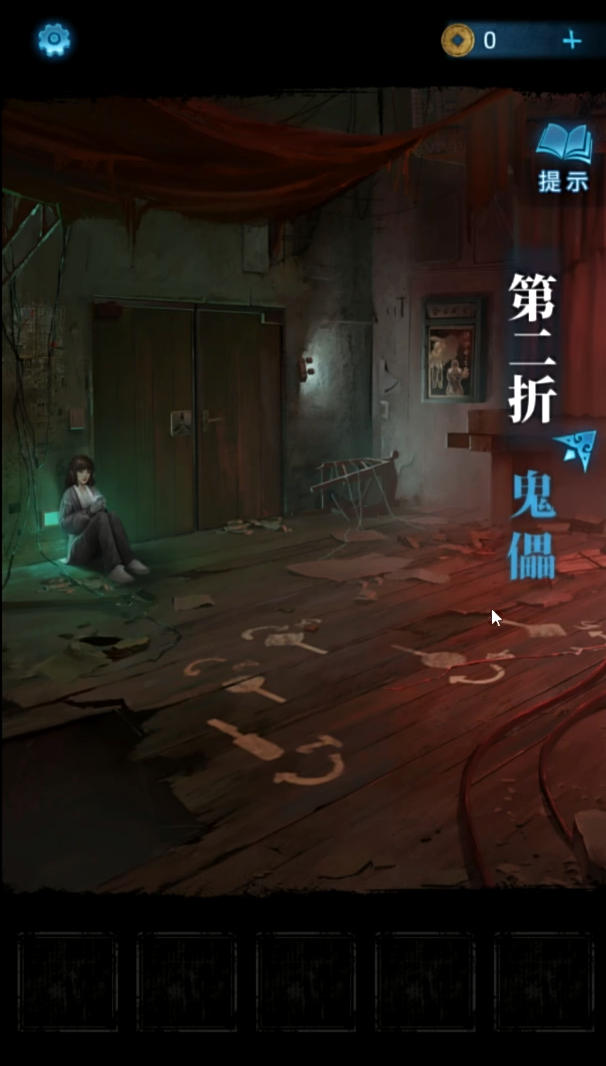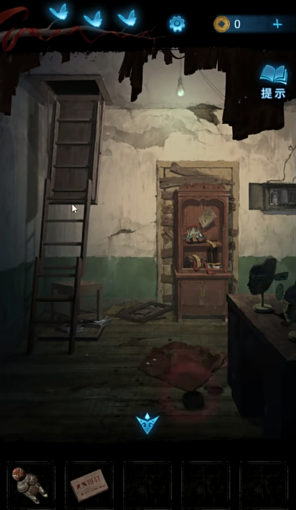 把钥匙插入墙上的电表箱,根据书籍上的提示点击箭头,顺序是【左、下、左、右、下、上】,返回钟梓宜所在的地方记住灯光规律,然后返回电表箱那里,把灯光调整成刚刚看到的规律,顺序是【红蓝白黑红】,然后在柜子左边获得一张【海报】,返回第一间房间把海报放在今日剧目栏里使用图钉固定住,然后就会发现戏台上的木偶戏变了。然后点击木偶就会进入应战,这是一个简单的ote游戏,结束之后就可以获得一个【凳子】。返回第二个房间里使用【凳子】,高度不够使用【几本书】和【手机】来增加高度,拉下阁楼的楼梯上去。