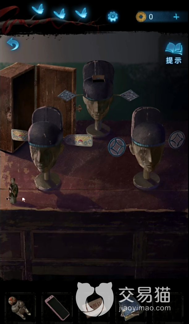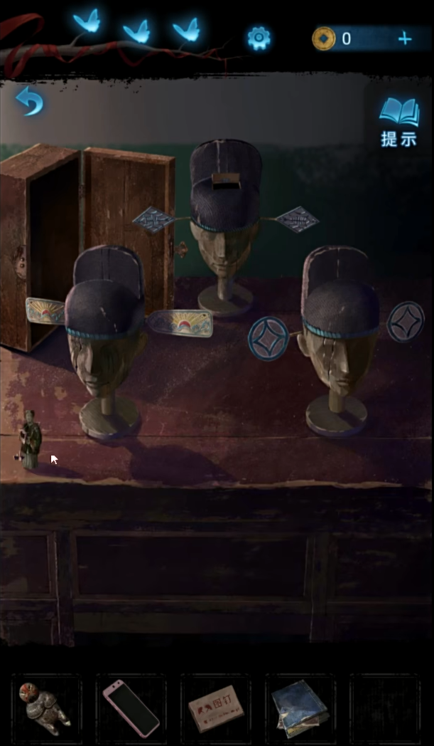 点击石门进去,点击棋盘看不懂直接掀飞棋盘(不愧是你梁少平!)就可以获得一个【上锁盒子】,点击木柜子,点击书籍获得鬼戏信息,返回外面将【上锁盒子】给钟梓宜开锁就可以获得【几本书】和一个【空盒子】,地板上的黄色提示注意记录下来,然后就可以进入石门里面,点击右边桌子按照地板上的提示点击帽子上的帽翅顺序分别是:长方形帽翅【往上】滑动【1次左边帽翅】,圆形帽翅【往上】滑动【2次右边帽翅】,菱形帽翅【往下】滑动【3次右边帽翅】,然后圆形帽翅【往上】滑动【1次左边帽翅】,最后菱形帽翅【往下】滑动【1次左边帽翅】就会出现一个拿着钥匙的陶人,由于陶人移动速度较快,使用【空盒子】进行捕捉就可以获得一把【钥匙】。