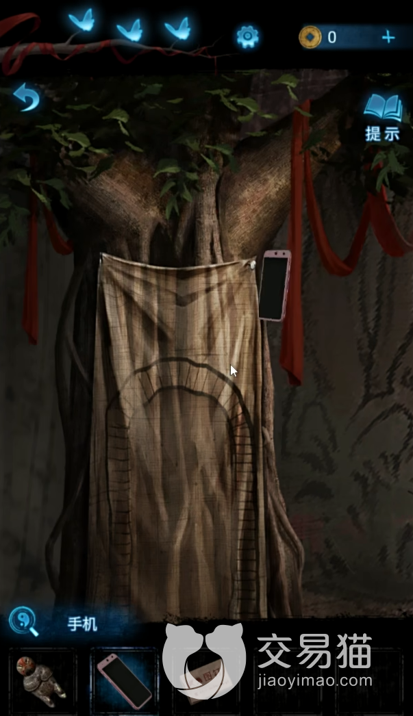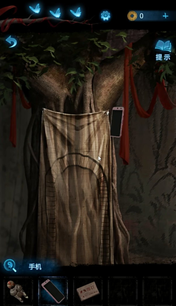 过完剧情之后点击木门发现门是锁住,然后点击小戏台触发剧情,这里会有一个小惊吓点,等待剧情结束之后就可以获得道具一把【长枪】和一个【木偶头】,然后探寻戏台旁边的树木可以获得一个【小雕像】,然后将【长枪】给钟梓宜过剧情之后就可以获得一个【手机】,点击左下角的洞使用【木偶头】就可以获得一个【图钉盒】,拥有图钉之后前往小戏台将书上的白布悬挂好,没有锤子的情况下,可以使用【手机】这个道具将图钉锤进去,树上出现一扇门。