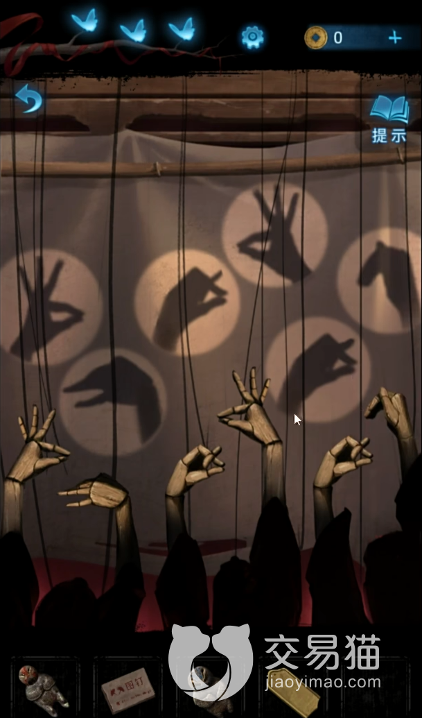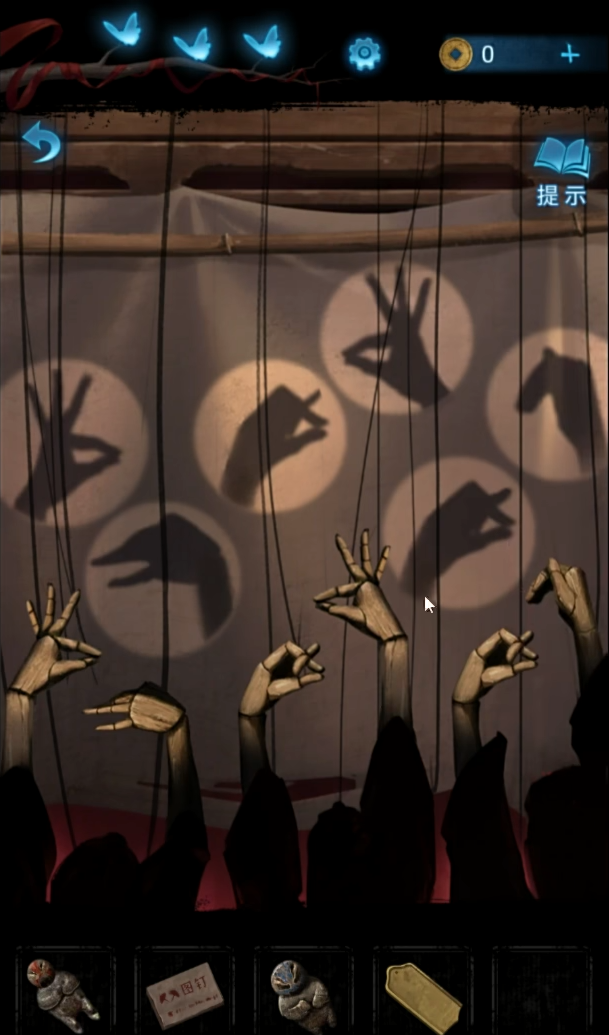 进入阁楼之后探索场景,得到木偶戏院信息,然后根据书上的信息,点击头上的操作线板,按照顺序分别点击左1,右2345,然后下楼回到木偶戏台那里点击梁少平的木偶,获得一个【小雕像】和一把【琴弓】,返回阁楼使用琴弓拉琴顺序是【353】、【17】、【62】获得一个【小牌子】,然后将木偶的手势调整到正确的姿势,如下图所示。然后按照该手势去点击电表箱:第一个点击第三个方块,第二个点击第一个图,第三个点击第二个图,第四下点击第三个图,第五下点击第二个图,第六点击第五个图获得一个小牌子。