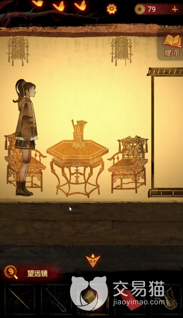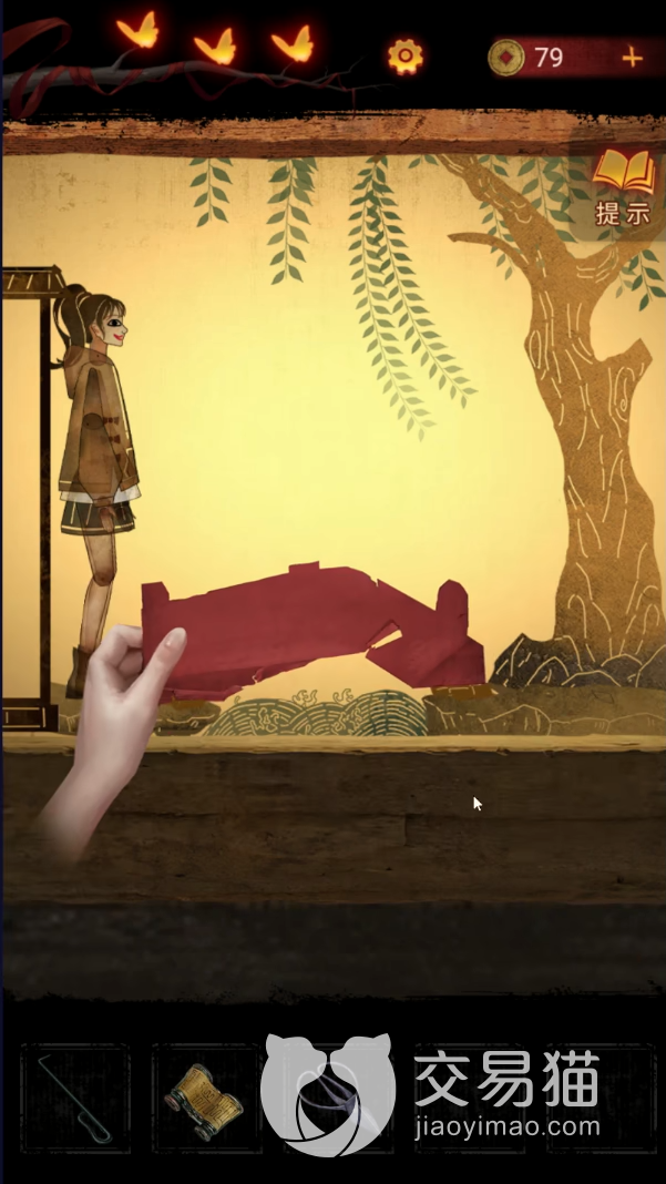 对着树根使用酒壶,就可以长出果子,根据书籍给出的线索,按照正确的顺序进行采摘,先采摘黄色的水果,然后可以获得剪刀,然后返回房间里面,对着颜料使用【水果】,然后用画笔蘸取就可以获得黑色颜料了,返回海报处开始画脸,触发剧情之后,返回楼下房间里面,对照着书籍上的桥使用红纸和剪刀,然后回到戏台将纸桥放上去,使用望远镜触发剧情。