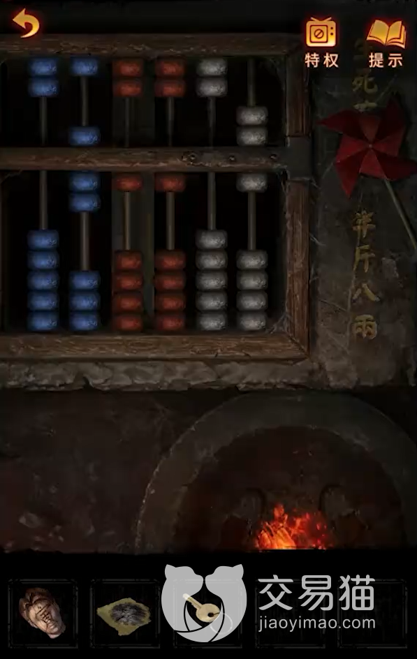 等待剧情过了之后,探索场景获得一个【木偶头】、【木板】,【纸灰】,然后点击碎石堆就可以捡一些碎石块备用,然后在门旁边的小洞里可以看到隔壁房间(又是葬老六的神龛),使用木板,然后用碎石块砸神像获得【钥匙】,然后根据神龛附近的彩色灯笼移动算盘珠子(如下图所示),获得【纸风车】。