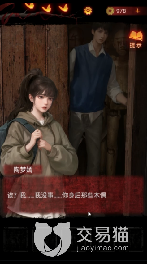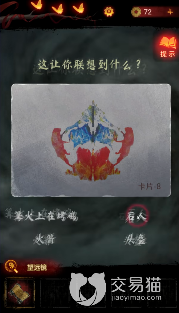 使用剪刀剪开抽屉上的锁,获得【卡片】,走到窗户外面,使用铁钩子获取【卡片】将全部的卡片放回桌上,测试可以根据自己选择。站在窗户处使用【望远镜】收集线索信息,然后重新点击桌上的卡片第一个选择皮影树木,第二个选择木偶照镜子,第三张是木偶,第四张是木偶,第五个是脸谱,第六个神龛,第七个是剪纸,第八个是石人,第九个是蝴蝶,第十个是布偶。获得锤子之后,使用锤子砸门,然后选择是幻术影响,然后选择益昌镇木偶戏院,第三个是真人,第四个是屠。