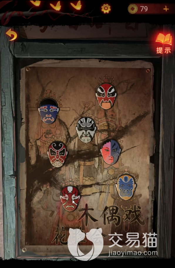 点击戏台触发剧情,使用【铁钩子】把石碑勾过来,获得【牌位】,返回下面的房间把牌位放在神龛里面,获得【望远镜】,触发剧情之后等待剧情结束之后返回戏台使用望远镜获得线索,对着指着自己嘴的人偶使用【葫芦】就可以获得【木剑】,把木剑给男童,然后等男童下来之后点击椅子就可以获得该道具,将椅子给站立着的木偶,然后使用望远镜观看戏台,获得【酒壶】,返回到之前脸谱区域,使用画笔把嘴画好。