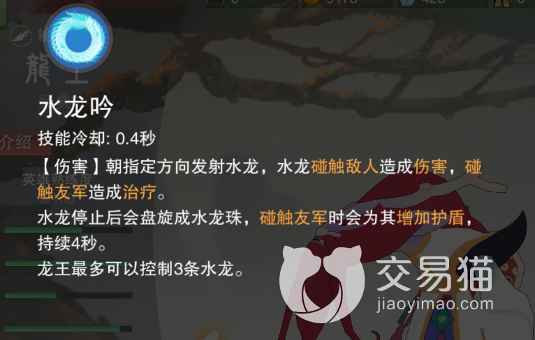 龙王的二技能是一个CD仅有0.4秒的伤害类技能,它的名字是“水龙吟”,具体的效果是朝指定方向发射水龙,这个水龙非常智能,碰到敌人会造成伤害,碰到队友则会转而提供治疗。