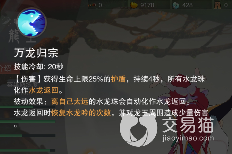 最后的三技能“万龙归宗”则是一个攻防兼顾的技能,它在使用后会直接为龙王自己生成相当于25%生命上限的护盾,并且所有水龙珠都会在之后化作水龙返回,返回之后它们不仅可以增加水龙吟的使用次数,而且还能在到达龙王附近时对周围敌人造成可观的伤害。