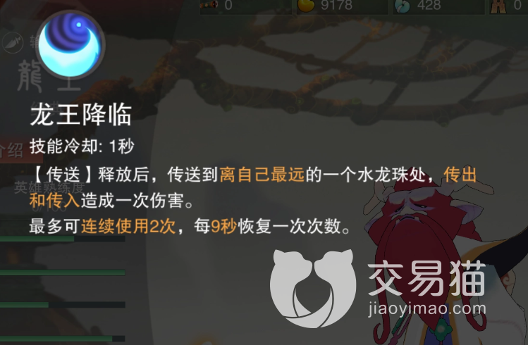 龙王的一技能是一个CD仅有一秒的位移,其名为“龙王降临”,使用后它会直接进行传送,传送的位置首选离自己最远的一颗水珠处,并且传送前和传送后都会对附近的敌人造成一次伤害,值得一提的是该技能并不能像想象中那般无限使用,虽然它的CD表面上看上去只有1秒,但却需要九秒的充能时间才能使用。