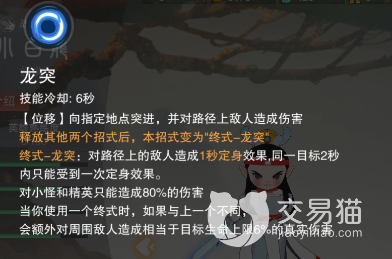 二技能的话则是“龙突”,这是一个CD六秒的位移技能,使用后会直接突进向目标地点,途中如果碰到其他敌人,那么还会造成一定伤害,可谓同时兼具了伤害与跑图能力。