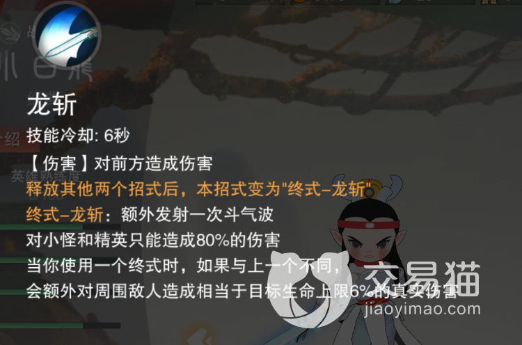 四技能“龙斩”的效果则显得有些平平无奇,它CD有六秒,不算短,并且效果也只是对前方造成一定伤害,伤害的上限也不高,但只要经过了终式版本的洗礼,那么它的效果就会得到大幅增强——在造成伤害的同时可以额外施放一次斗气波,相当于同时对面前的敌人和远处的敌人都分别进行了打击,双重洗礼之下,敌人的队伍将会一下子被剿灭殆尽。不过这种和龙突一样,都不适合打野,因为会有20%的伤害衰减。