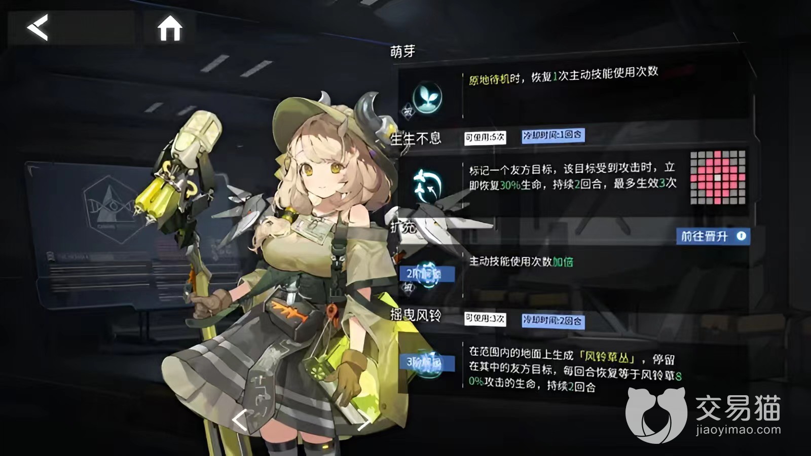 而且风铃草在游戏里面还能够将自己的主动技能的次数给恢复,所以给他搭配一个激励模组就比较好了,那还有一个治疗技能是生生不息,可以为队友提高生存能力,当队友受伤了之后,也可以为他回复血量,这个角色不论是在后期,亦或者是在开荒的时候,对他的等级要求都并不是很高。
