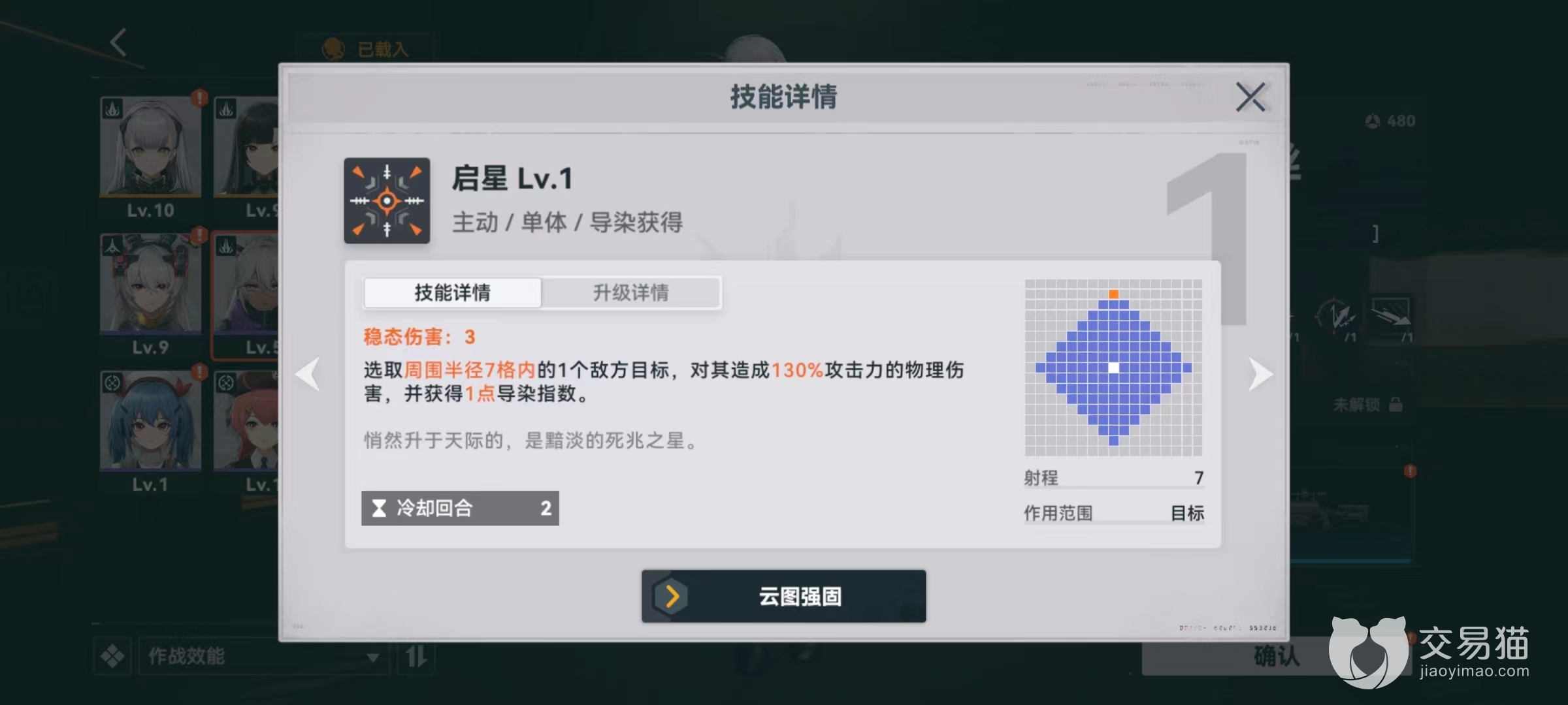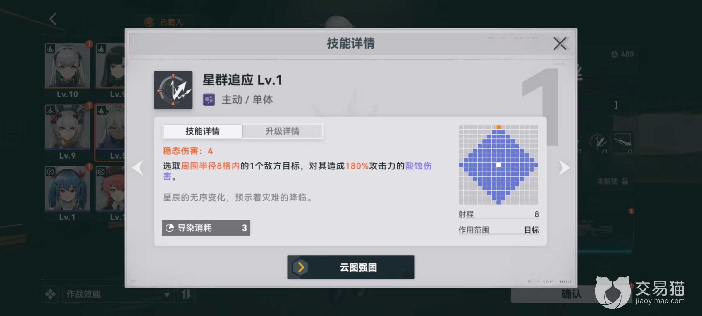 最后是被动远距观测,在攻击距自身半径5格以外敌方目标时,造成伤害提升,并且获得一点导染指数,升级之后伤害加成再次提升,最多能增加两点指数。这也具有意味着该角色非常适合用来攻击远处目标,通过这一特点快速将指数积累起来,频繁发动星群追应,才是正确输出循循环。