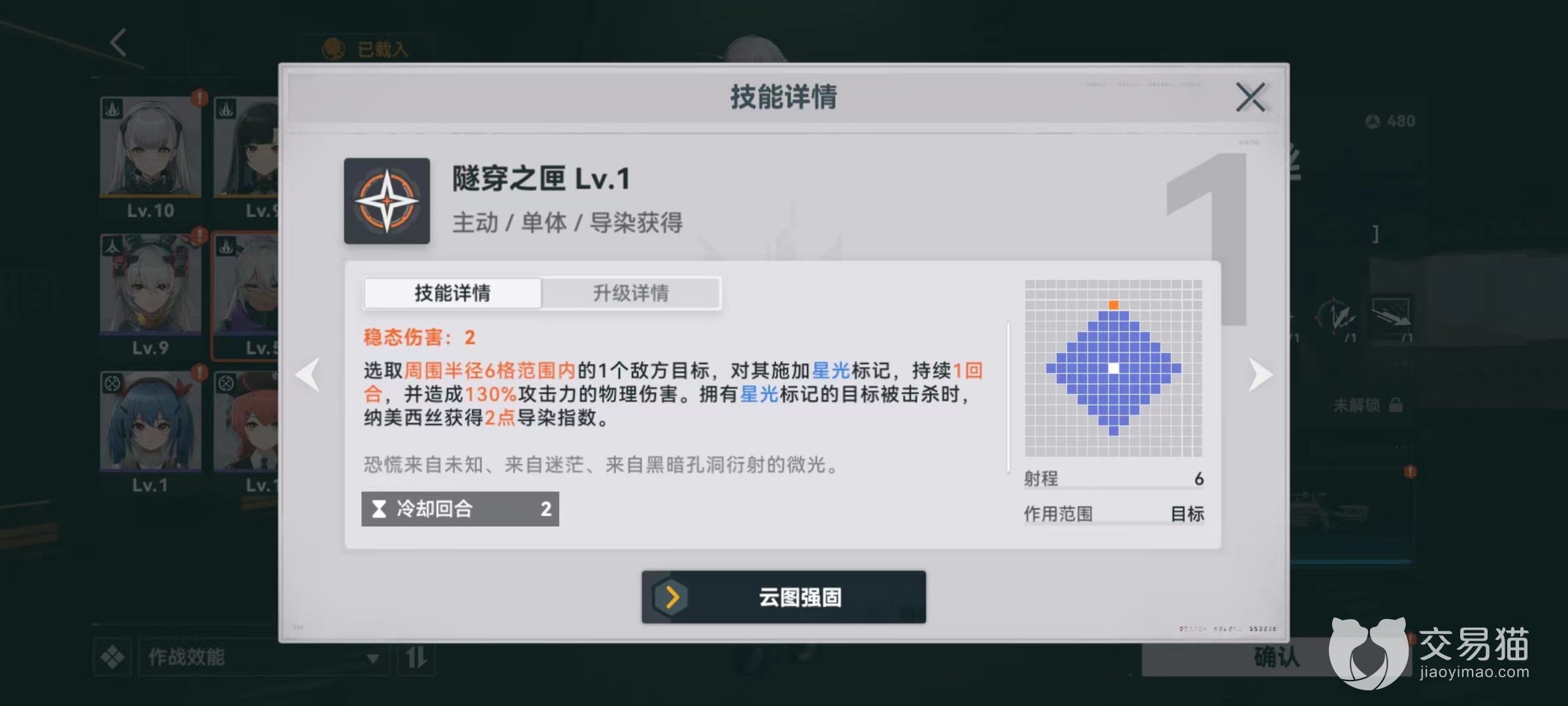 主动技能隧穿之匣,这一次攻击范围变成了半径6格以内,选中之后对其施加星光标记,该标记持续一回合并造成一次物理伤害。在数值方面和上一个技能启星相当,如果带有星光标记目标被击杀,则该角色获得两点导染指数。虽然这一次攻击范围低了些,但是可以通过升级以后增加一格。主动技能星群追应,选取8格以内任意敌方目标,造成一次高额攻击力的酸蚀伤害,升级以后伤害还能再次提升,并且导染消耗减少,射程增加。前面积累起的导染,可以在这个技能中消耗出去换取高额伤害。