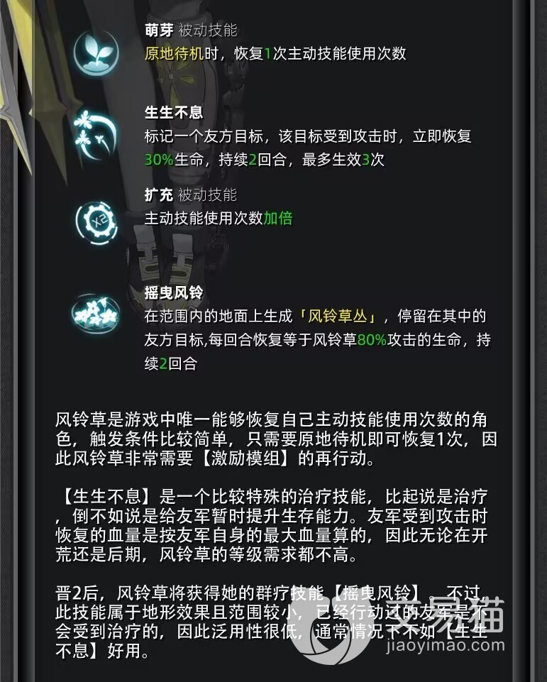 风铃草的第二个技能是"生生不息"。使用该技能可以为一个队友施加一个回血的增益效果,当该队友受到攻击时将恢复30%的生命值。这个增益效果将持续两个回合,总共可以触发三次。这个技能能够有效地保护友方目标,尤其是那些防御较低的角色,免受致命伤害的影响。通过善用这个技能,风铃草能为队友提供持续的回复支持,增加他们的生存能力。