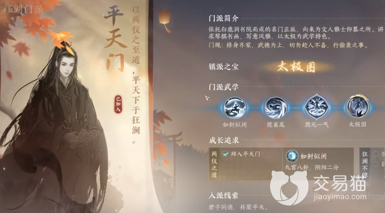 这是白鹿洞书院依托而成的名门正派,文人雅士的仰慕之所,以太极图为武学镇派之宝,追求琴棋书画与写意风雅。因为这是一个主打和谐相处的门派,所以禁令是:即使是雁门关野外,也不可能主动开红名攻击、偷袭其他玩家。