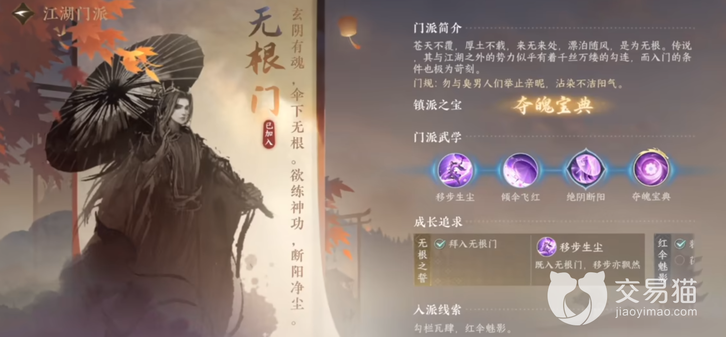 原因有魂,上下无根,欲练神功,断阳静尘。镇派之宝是夺魄宝典,门派入门条件比较苛刻。玩家需要先触发锦伞红衣奇遇,做系列任务。禁令:禁止与男性玩家进行双人动作互动。
