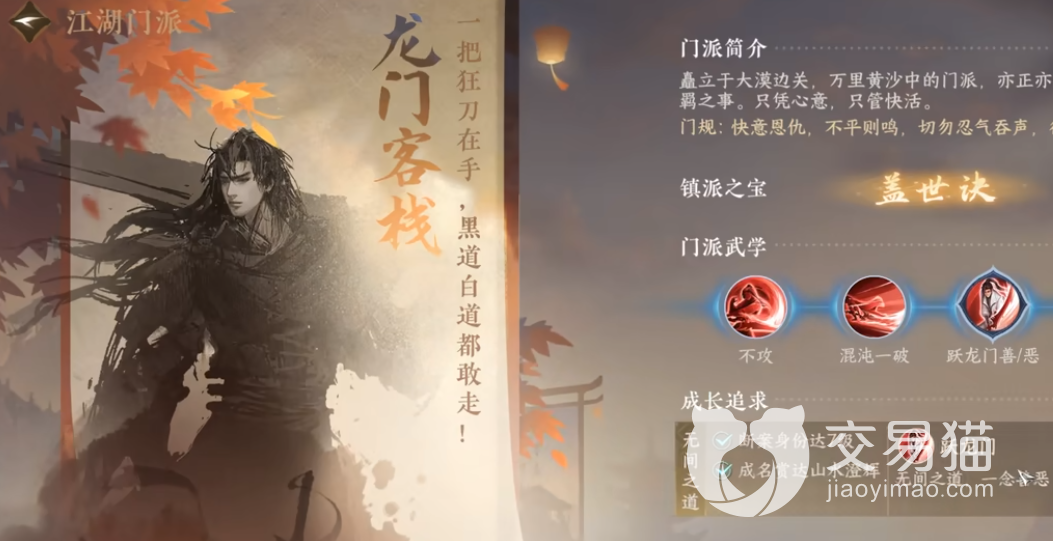 矗立于大漠边关的龙门客栈亦正亦邪,一把狂刀在手,黑道白道都敢走,行事只求随心所欲,只管快活。玩家入门派之前要作奸犯科,被抓进大牢,然后触发困兽之斗奇遇。禁令:野外被玩家打的时候不能逃跑,进入副本不能死太多次。