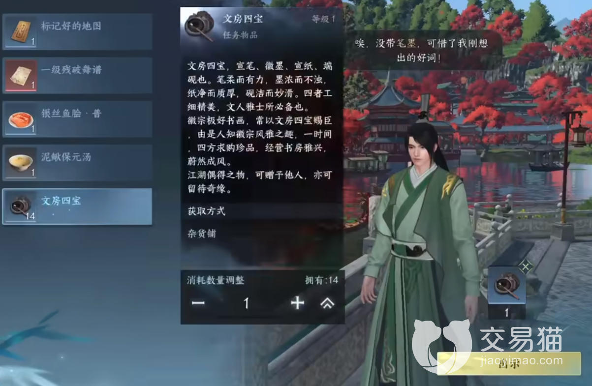 首先,领取一曲阳关任务前提是下雨,玩家可以打开小地图看天气预报。必须在汴京下雨的时候才会出现NPC宋乐词,他的位置坐标是汴京(1238,1158)。玩家来到桥头上可以看到宋乐词正在整理自己的思绪,但是苦恼没有带笔墨记录灵感。此时玩家与他对话,出示从杂货铺里买到的文房四宝,在宋乐词的感激之下,他会为玩家念一首刚写好的词。