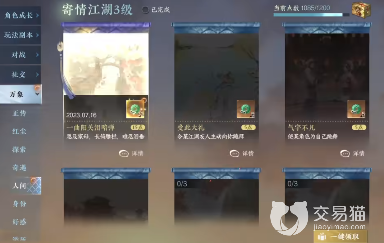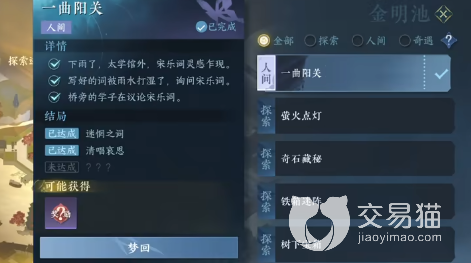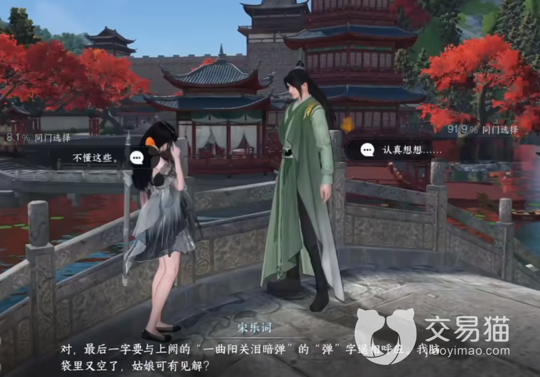 选项二建议清唱词,玩家用轻功飞去接任务的那个桥,就能看到宋乐词到桥头清唱一首,收集结局清唱哀思。最后,玩家打开寄情江湖,可以领取一曲阳关泪暗弹的成就奖励,共30个绑定纹玉。