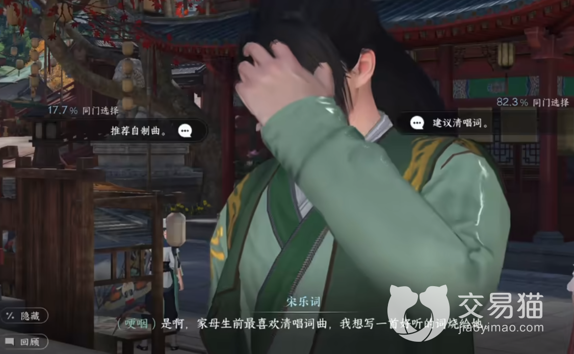 重新选择梦回,打第2个结局清唱哀思。选择支项认真想想,提出飞或者飘字,最终敲定的是寒字。宋乐词拿到满意的结果之后,就急着去找乐师合词,玩家后续可以在曲园找到他。