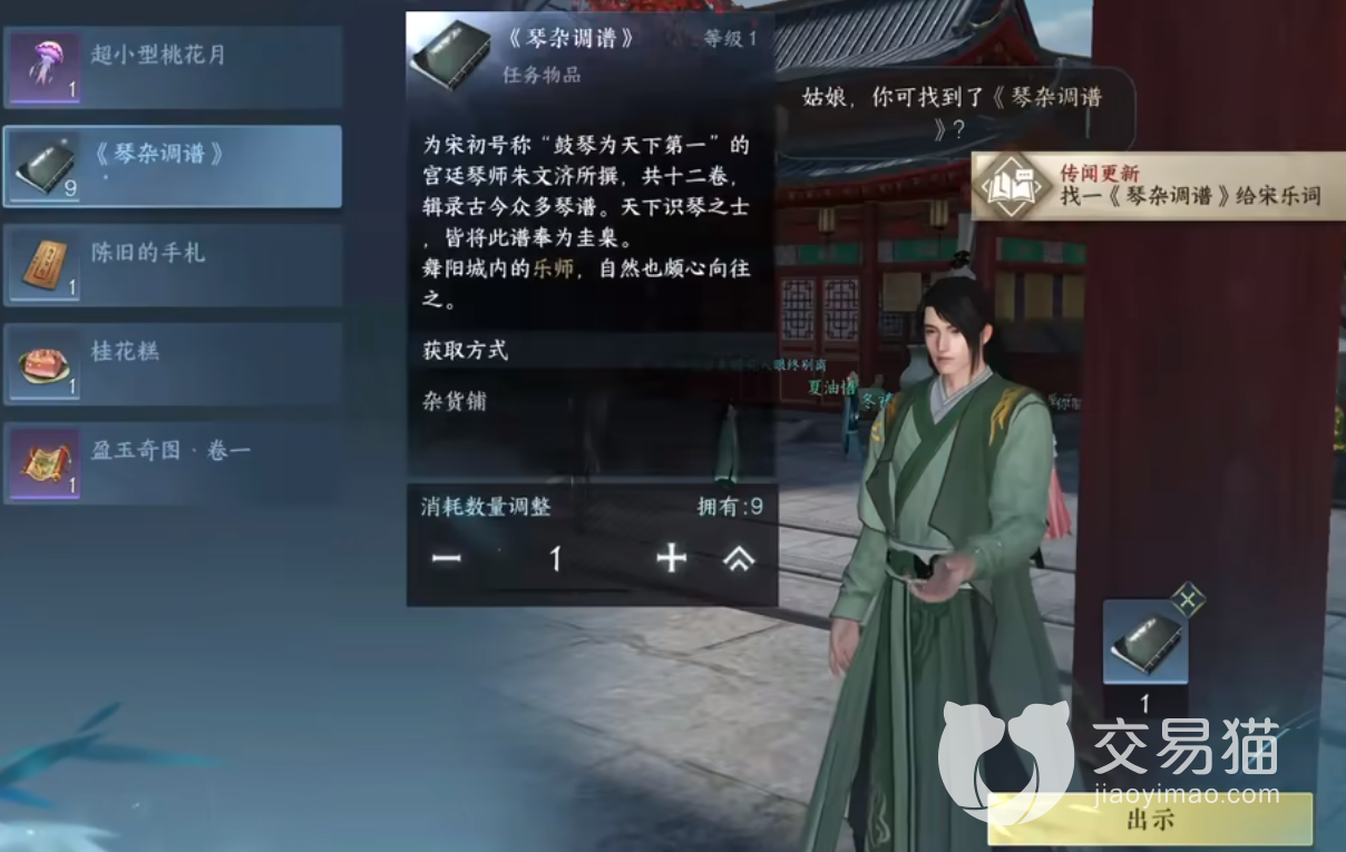 选项一推荐自制曲,提议宋乐词自己编曲,这里需要提交宫廷琴师所著的《琴杂调谱》,玩家可以从杂货铺里面买到。