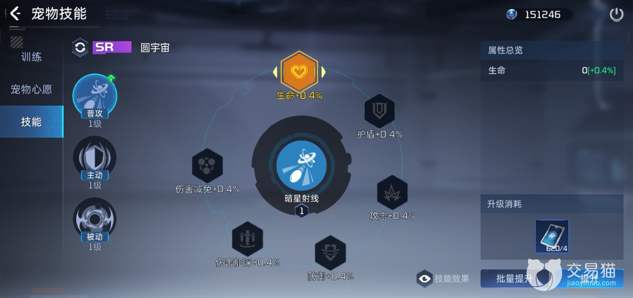 还有一项对宠物技能的培养,每一个技能有生命、护盾、攻击、防御、伤害加深、伤害减免六个维度,全部升级一圈后,就可以进行技能升级了。以上所需升级材料为通用数据,在宠物商店抽到重复宠物会自动分解为通用数据,你也可以用抽宠物获得的积分在宠物积分商店中买到通用数据。