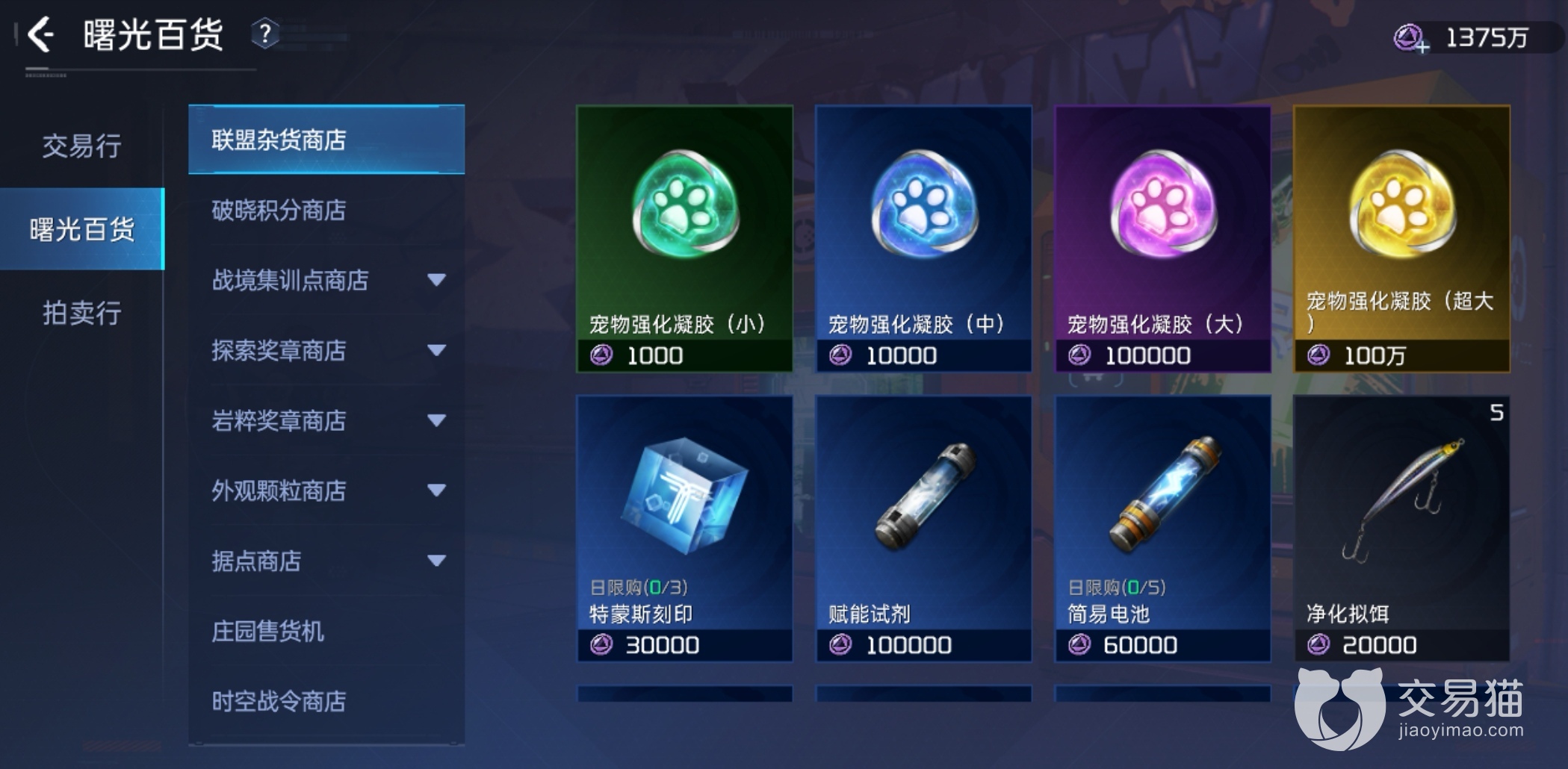 联盟点可以在曙光百货的联盟杂货商店购买资源,比如宠物凝胶提升宠物能力,特蒙斯刻印可以在地图场景中留言,你还能买到给武器赋能的试剂,简易电池,净化拟饵,各种型号的枪械配件箱等。据点商店和庄园售货机中的商品也需要用联盟点购买,此外联盟点还可用于升级身份天赋、公会科技等。