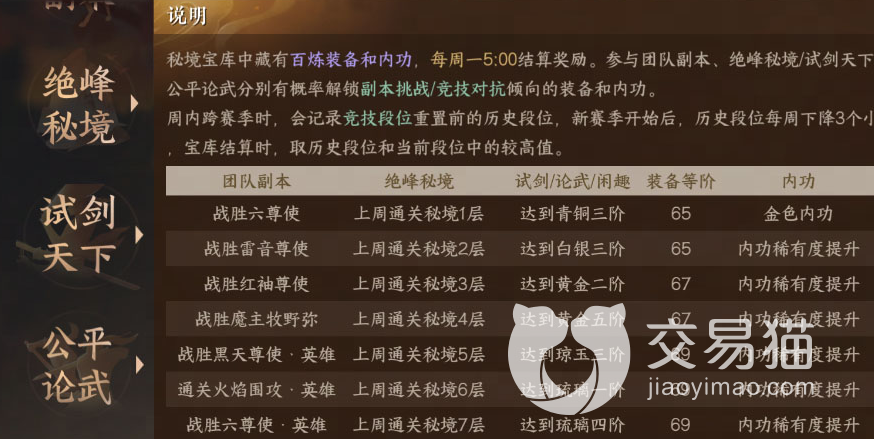 就目前来看该奖励系统可以说是一个非常良心的奖励系统了,在版本更新后的秘境宝库中大家可以看到非常多的稀有内功和带有稀有词条的百炼装备,这些都是可以免费获取的,只需要大家完成每种的任务就可以了,完成后就可以吃到保底随机在里面拿一件。
