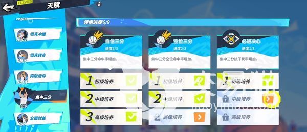 大家还可以再带上集中三分,其中有一个名为空位三分的技能,能让角色在进攻的时候集中三分,空位命中率得到一定程度的提高,抗干扰力提升。除此之外,还可以带上坦克冲撞,坦克转身,突破后仰以及全面封盖等天赋,能够有效的提升该角色的强度哦。
