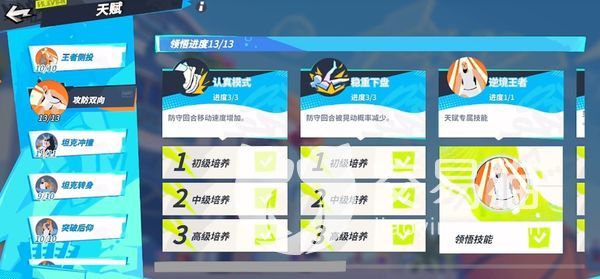 比如大家要是打防守回合的话,就可以选择攻防双向,它里面有一个稳重下盘的效果,可以让角色在防守回合的时候被晃动的概率得到一定程度的减少,可以让角色在防守回合中移速得到一定程度的增加,还有逆境王者是天赋的专属技能。