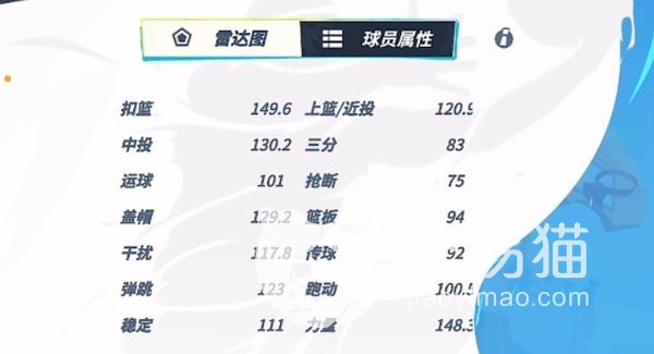 该角色在游戏中力量,扣篮,盖帽,中投都是非常强的,他的这些数值表明该角色不仅适合做sf,还可以成为pf,他在防守方面的强度天生就具有一定的优势,因此也主要是选择一些强化该方面的天赋。
