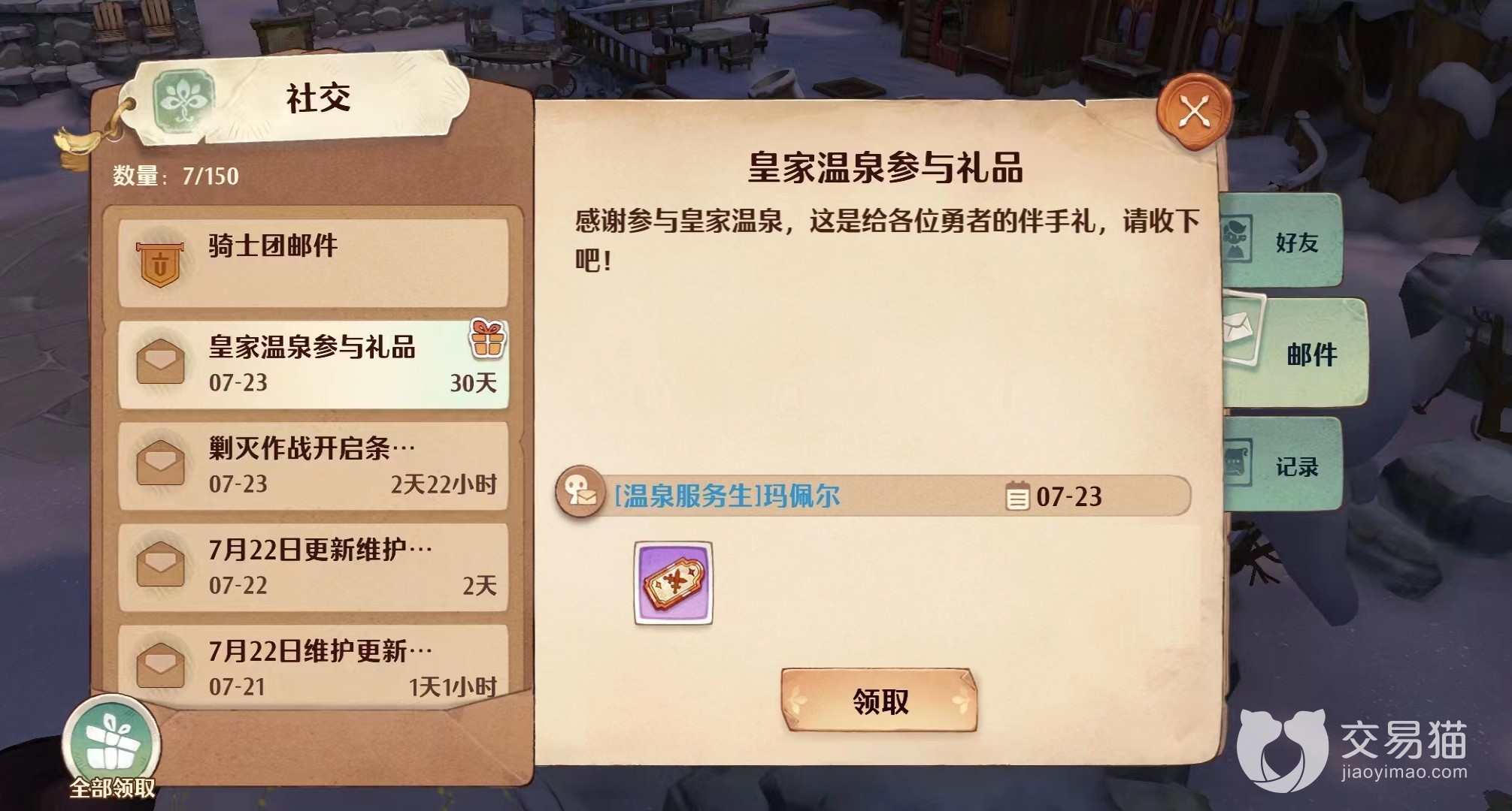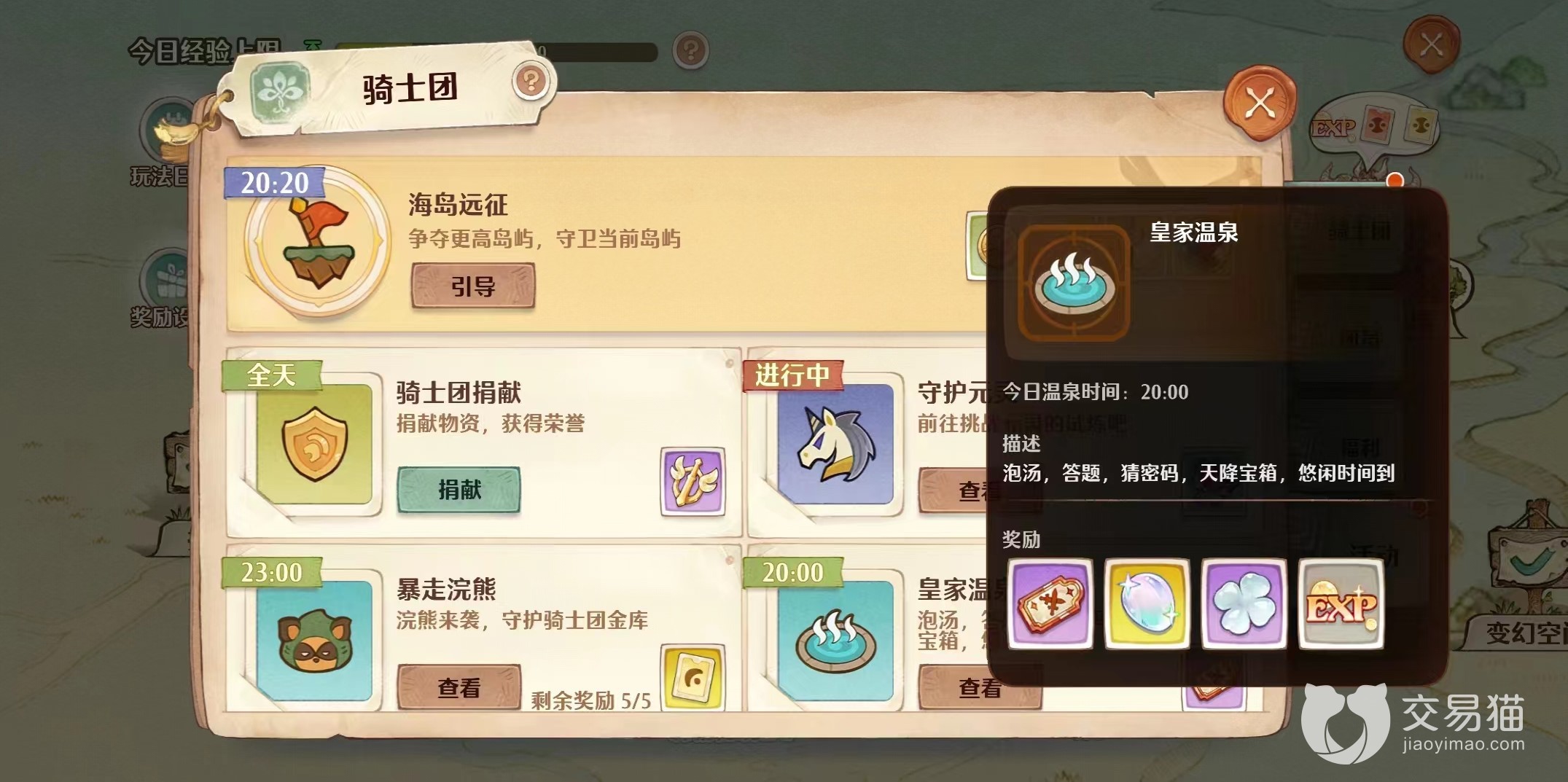 在每天的8点骑士团的成员们都可以进入骑士团领地之内参与活动。温泉活动分为了好几个内容,包括了答题、扔骰子和开宝箱活动。其中开宝箱活动难度高一点,需要有足够多的玩家参与,这是一个需要团队合作才能完成的项目。