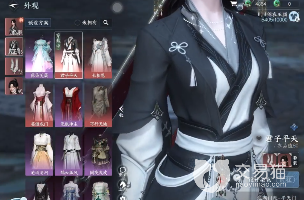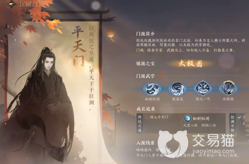 加入平天门之后想要获取服装的话,玩家需要去看门派的第二个成长追求任务,获得化劲掌法。任务位置就在平天门门派中央最里面的小屋后面。玩家进去之后左拐会看到一个宝箱,打开宝箱就可以拿到化劲掌法了,之后去找到武德长老领取服装就可以了。平天安门的服装以黑白灰三个色调为主,其中上衣外袍以黑色为主,内搭裙摆以白色为主,下摆为灰色渐变,整体看起来洒脱肆意,充满江湖气息。
