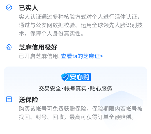 平台对于卖家的资质有着一些要求,当然也会进行一定的公示,帮助我们来进行区分和选择。小编也比较推荐大家在选购时注意商家是否完成了实人认证,他的芝麻信用评级是多少。一般来说经过认证或者是信用等级较高的卖家比较靠谱,不太会出现账号找回、虚假宣传等情况。在交易猫中有很多的游戏账号带有赠送保险的福利,在购买之后如果游戏号本身出现了无法登录、密码错误、被找回等情况,可以在保险生效期限内找客服来进行索赔。
