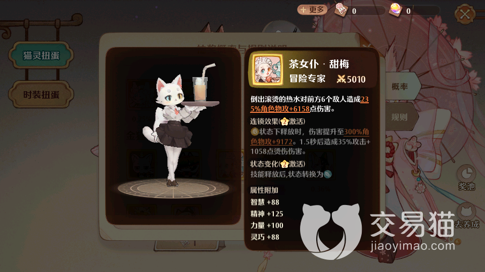 第二个值得推荐的就是茶女仆甜梅,这个猫咪大家别看外观非常可爱,但是其战力也是很强大的,可以造成范围性攻击能力,面对所有敌人都毫不慌乱,造成235%的物理攻击效果,之后还能叠加6000左右的伤害能力,在连锁效果下,自身的攻击效果还能提升300%左右,同时每次制造攻击还能叠加一定的烫伤能力,这也就意味着这个角色可以使敌方陷入持续掉血状态,她的属性附加可以增加88的智慧效果,能让玩家们实力大幅度提升,是游戏内非常有名的冒险专家,培养难度也比较高。