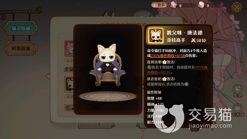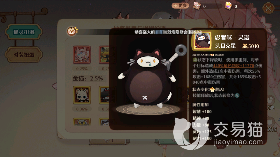 最后一个值得培养的猫咪是忍者咪,他是头目克星,在团队作战中可以拥有一击致命的效果,在技能释放的过程中,他可以对敌方单体目标造成3360的角色物理攻击效果,还有9000多的额外伤害,在造成连锁效果的前提下,他还能手持长剑对敌方头目造成440%角色物理攻击伤害,还有1万以上的攻击额外加成,并且还能使其陷入三次中毒效果,每次还能降低一定的损耗,在团队作战中可以让敌方无处可躲。这个角色不但战斗实力强势,他的属性附加也是非常多的,智慧,精神,力量,灵巧,耐力都可以为我们叠加100左右,是游戏内非常值得推荐的忍者大师。