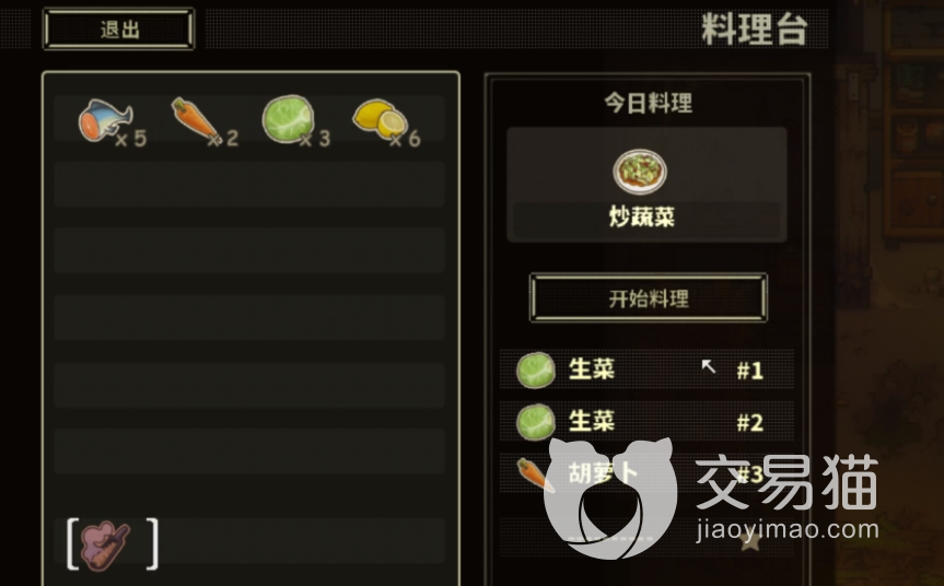 食谱:三个蔬菜类型的食材混合即可,可以三个青菜、三个胡萝卜等。效果是恢复4点血量。