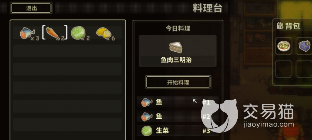 每次料理需要放三个食材,部分菜谱只需要一样或者两样食材,但是每次料理都需要放满三个。比如鱼汤食谱是柠檬与鱼肉,玩家可以放两个柠檬、一个鱼肉,或者一个柠檬、两个鱼肉都行。