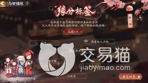 除了这五大篇章之外,在游戏中还会上线很多主题小活动,这些小活动有缘分标签、守缘合战、七日结缘等等,首先是第一个缘分标签,大家可以在活动主页面找到这个活动入口,之后进入就可以了,进去之后大家就能看到很多特殊的标签,这些标签大家可以自己选择携带最多可以携带四个。